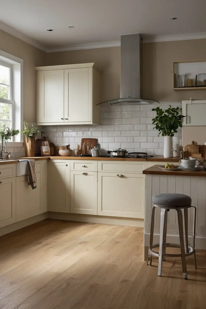 This soft off-white has subtle warm undertones that create a cozy yet spacious feeling in small kitchens. It offers more character than stark white without feeling heavy.
