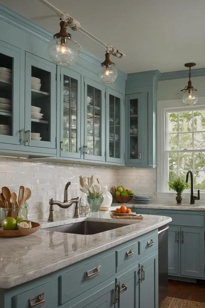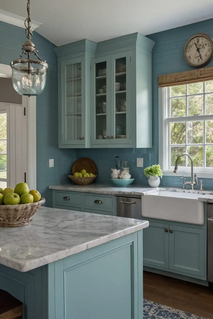Palladian Blue provides a refreshing backdrop that feels clean and airy. It pairs beautifully with white cabinets and natural stone countertops.